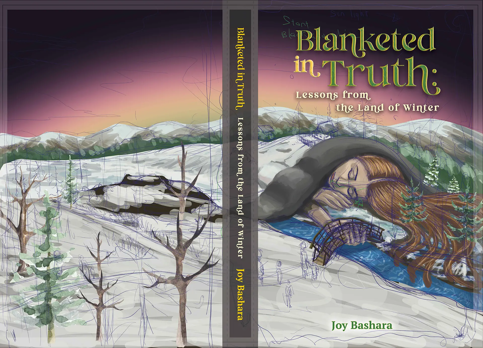 I collaborated with client Joy to establish the book’s look and feel. Book editor Emma Tyler shared unique ideas that guided our sketches. The rough sketch in the first image is where we agreed to begin. Emma suggested a digital painting style, so I designed the cover entirely with brush strokes in Photoshop.
